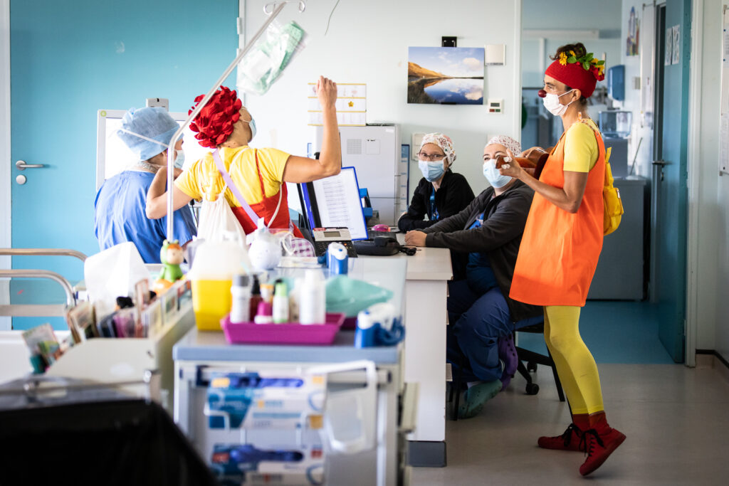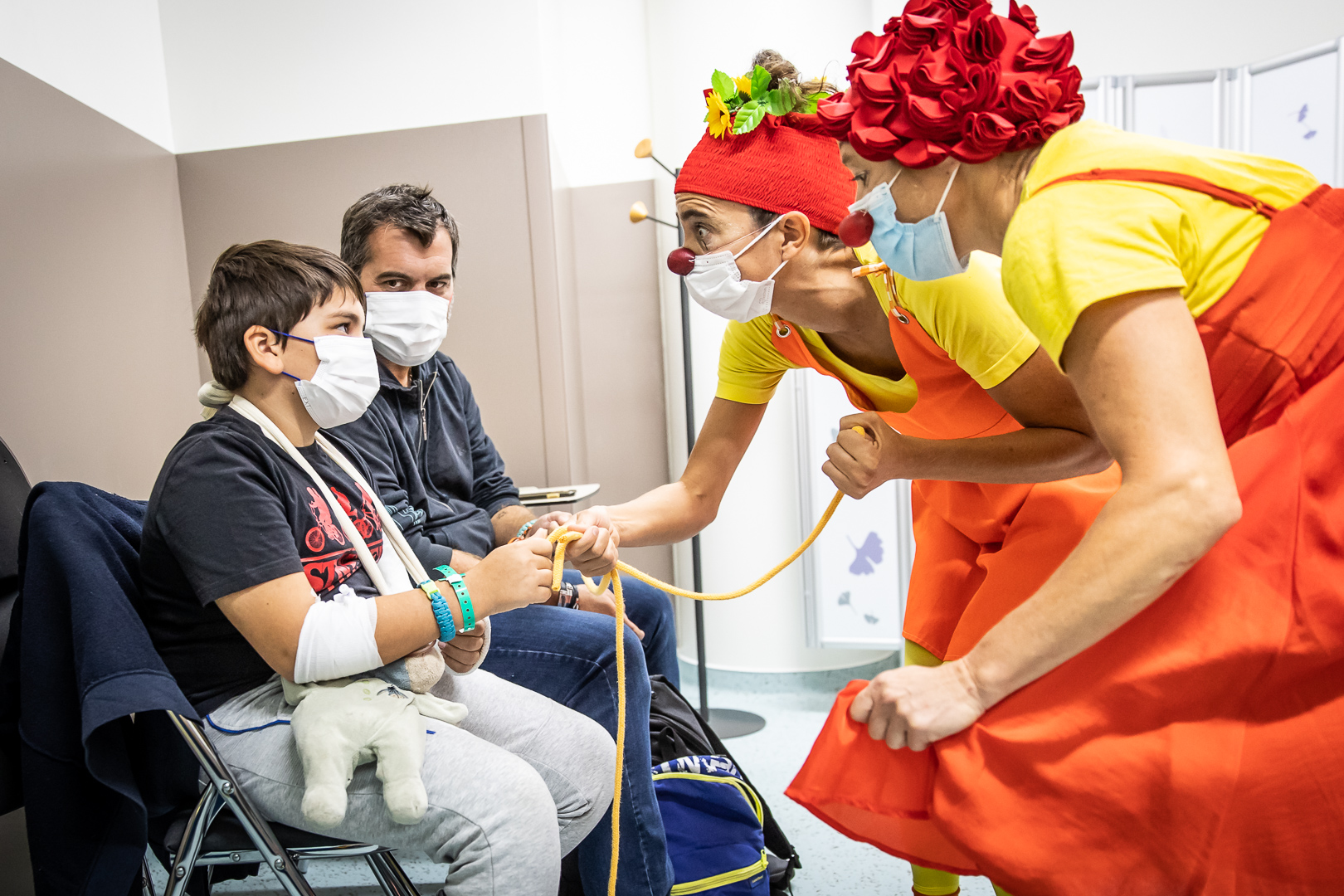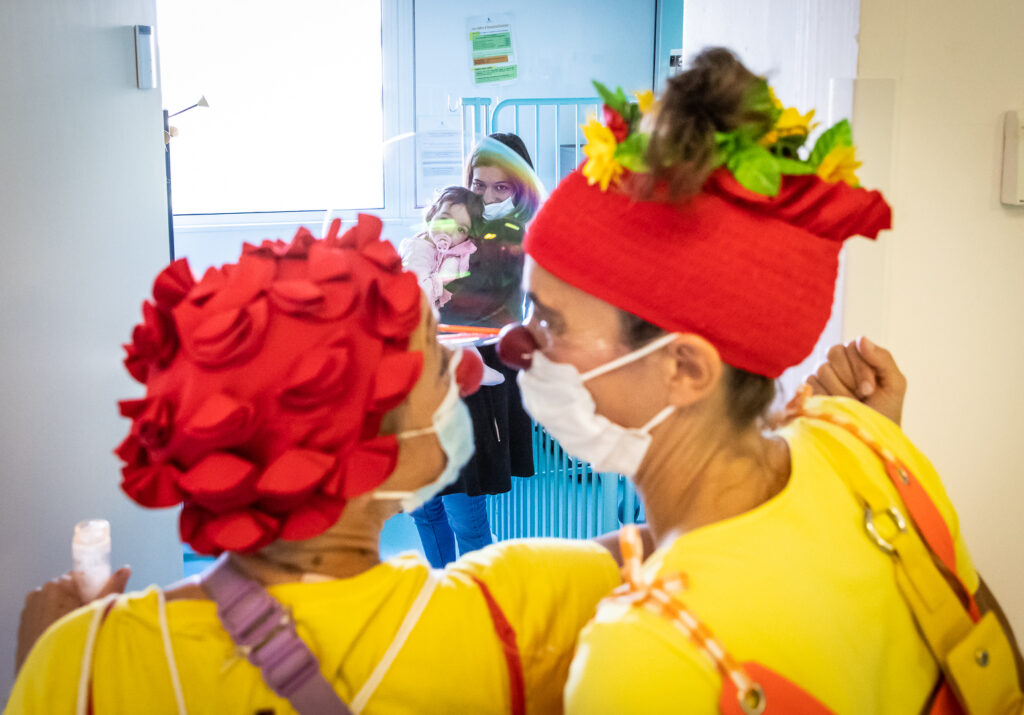 Deux jours par mois, de mai à décembre 2022, un duo de clowns des associations lyonnaises VIVRE AUX ECLATS et docteur CLOWN se rend à l’Hôpital Femme-Mère-Enfant (Bron) pour accompagner les enfants tout au long de leur parcours opératoire.