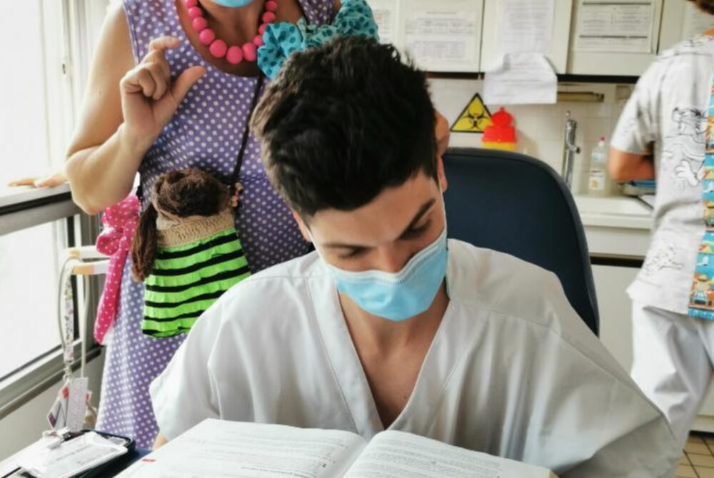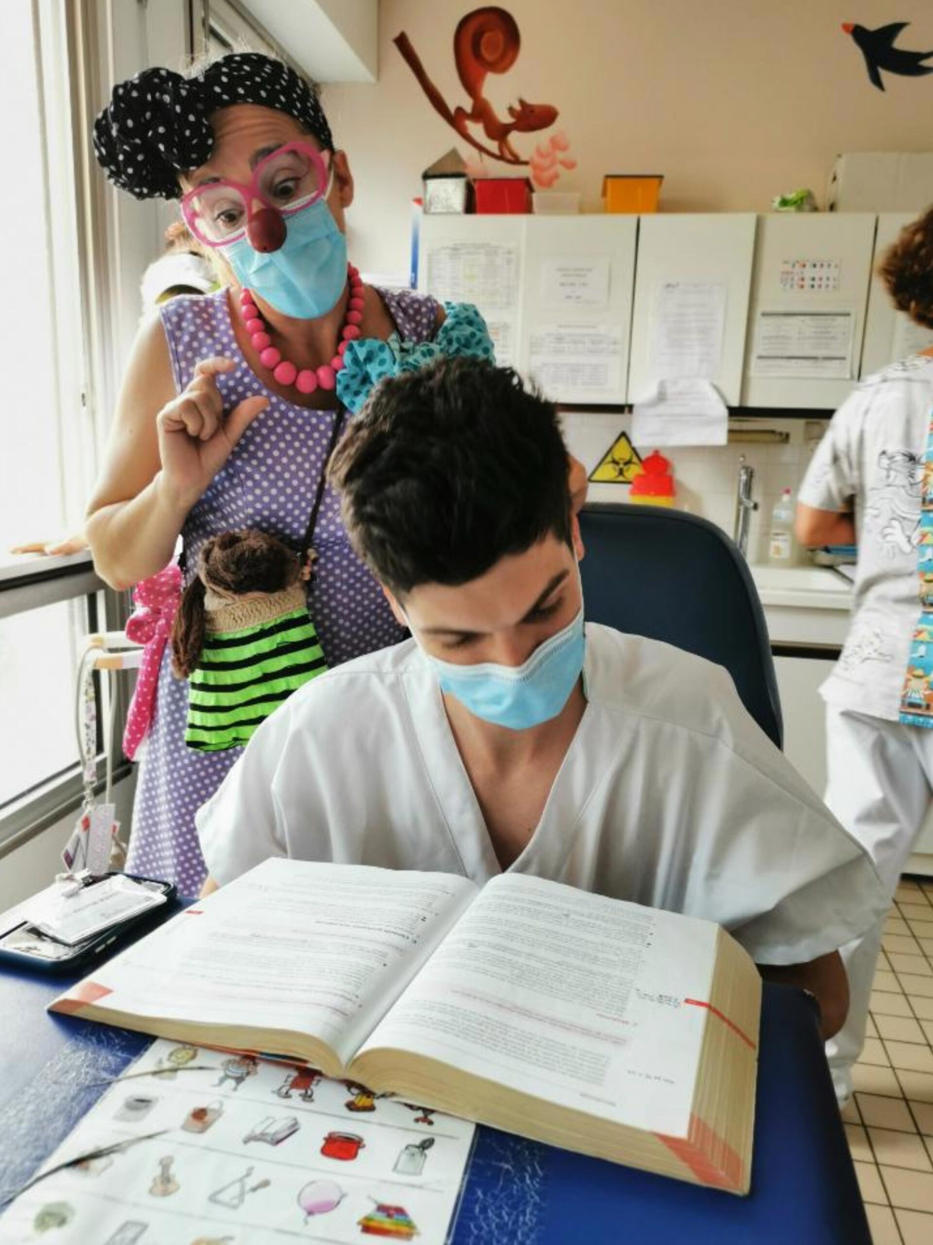 Depuis 2012, les duos de clowns professionnels de l’association Des Boules Aux Nez sont formés à l’intervention en milieu hospitalier. Artistes et non thérapeutes, leur parcours allie formations artistiques, expériences théâtrales et stages dans le monde hospitalier. Leurs outils sont le mime, la musique, le chant, la marionnette, la danse… tout ce qui amène du jeu.