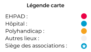 Les associations membres de la FÉDÉRATION sont implantées dans plus de 120 villes, dans 35 départements de l’hexagone et sur plus de 150 lieux d’intervention (Hôpitaux, EPHAD, Centres médicaux sociaux, établissement pénitenciers,…) :